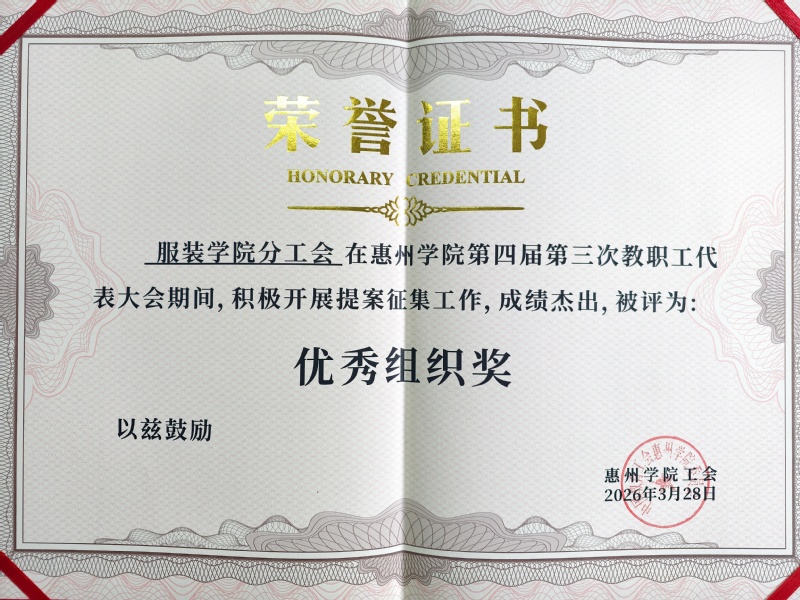 3月28日,学院分工会在惠州学院第四届第三次教职工代表大会中,因组织得力,成绩显著,荣获优秀组织奖。撰...
