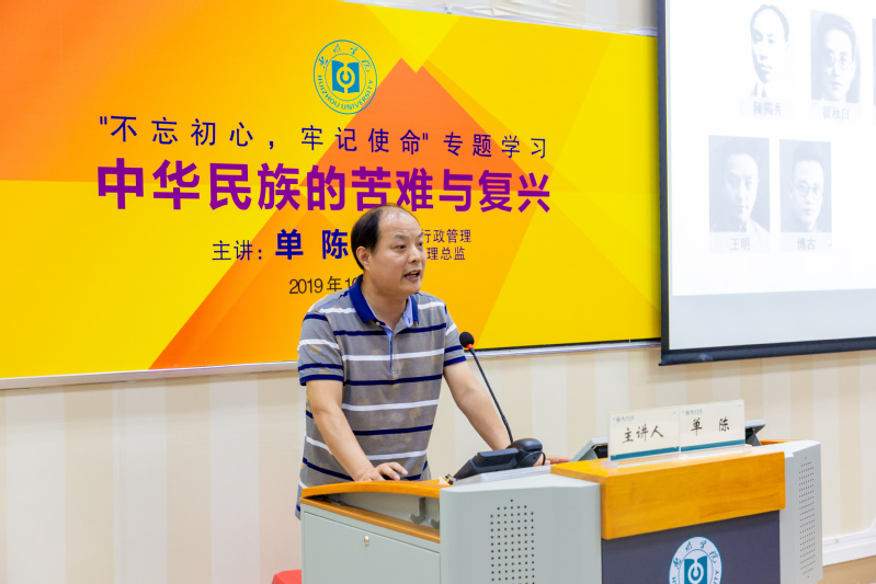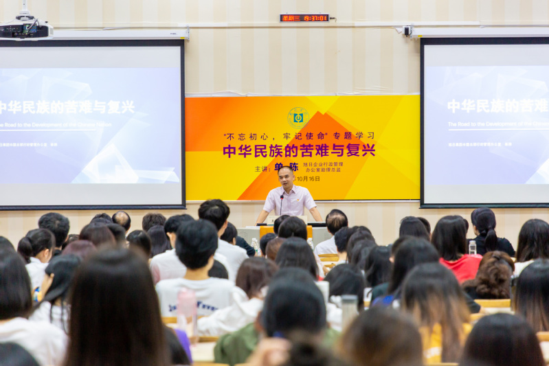 10月16日晚上,旭日广东服装学院在服装楼101阶梯教室开展“不忘初心、牢记使命”专题学习。我院党建共建单位旭日集团的行政管理办公室助理总监单陈同志应邀主讲:中华民族的苦难与复兴。旭日广东服装学院领导班子、全体师生党员、入党积极分子约200人参加了本次讲座,讲座由党总支书记曾裕林主持。
