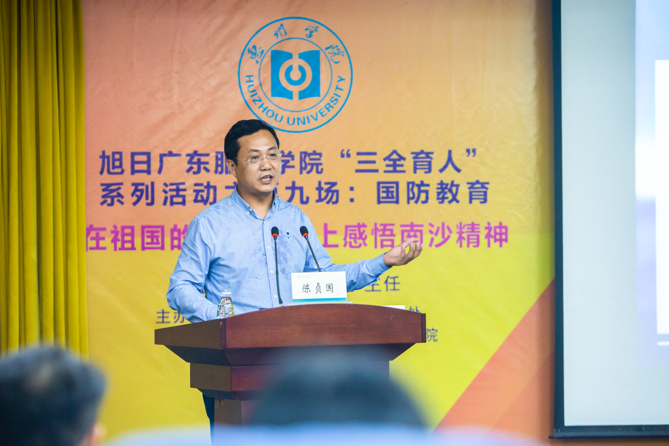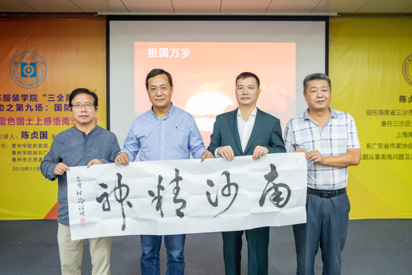 11月5日晚,由惠州学院武装部、保卫处、旭日广东服装学院和惠州市志愿者联合会主办的旭日广东服装学院“三全育人”系列活动之第九场:国防教育——“在祖国的蓝色国土上感悟南沙精神”主题讲座在图书馆报告厅举行。讲座特邀海南省三沙市政策项目研究中心主任、三沙历史文化研究会会长、上海海洋大学教授陈贞国先生主讲。广东省青年摄影家协会常务副主席、惠州市志愿者联合会会长叶卫星,惠州市志愿者联合会副会长丘洪江,知名摄影家钟永谦,惠州市青年摄影协会副主席蔡东云,惠州学院武装部副部长、保卫处副处长吴飚,旭日广东服装学院全体领导班子和教师,以及惠州市志愿者联合会代表,学院第一期青马班、团校团员培训班成员、学生党员等学生代表约250余人聆听本次讲座。讲座由旭日广东服装学院党总支书记曾裕林主持。
