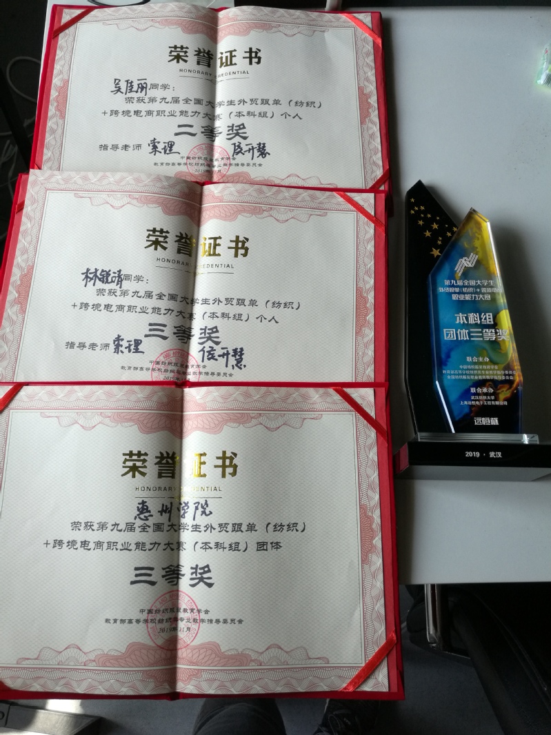 11月2日,“第九届全国大学生外贸跟单(纺织)+跨境电商职业能力大赛”在武汉纺织大学顺利举办。我院服装设计与工程系索理、徐丽丽、侯开慧三位老师带领的安东尼协同创新中心学生团队参加了此次比赛。最终,我校服装学院2017级服装设计与工程专业吴佳丽同学获得个人二等奖,2017级服装设计与工程专业林锐清同学获得个人三等奖,获得团体赛三等奖。