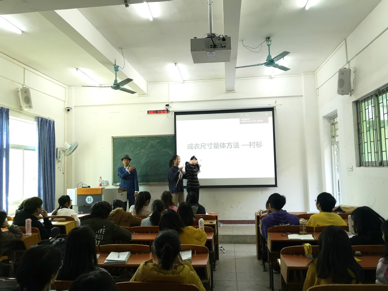 讲座中,杨总运用他29年的从业经验,在课堂中直观地呈现了企业从了解客户到对客户进行量体的基本流程,详细讲解了制作衬衫的必备尺寸,以及量体的部位和注意事项。他在现场示范了成衣衬衫的量体、量体时如何与顾客进行交流,及对凸度体、驼背体、高低肩等特殊体型尺寸进行放缩的技巧,同时对男女装衬衫所需测量尺寸进行了对比区别。在课堂中,同学们积极与杨总互动,并自告奋勇上台尝试量体。大家在这个学习过程中发现问题、解决问题,学习效果大大提高,同时也深切感受到了衬衫量体有很多细节是值得我们学习和注意。杨总对同学们在量体中存在的疑惑进行解答,进一步分析了企业在接收到定制订单后,进行布料采购、量体、制作、包装、后整理的整个过程,让同学们深深体会到课堂所学知识与实际生活工作中的紧密结合。对于讲座过程中同学们的活跃表现,杨总感到十分欣慰感动,他对同学们提出了自己的期望,希望今后还可以多来我院开设更多相关课程,加强合作,培养更多应用型创新技术人才。