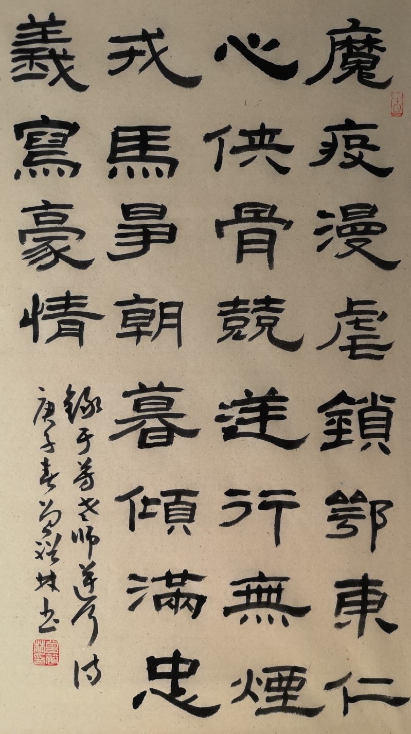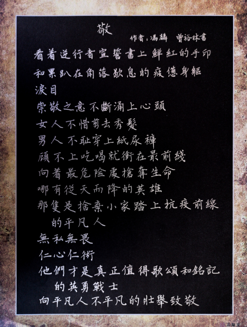 新型冠状病毒感染疫情牵动全国人民的心,无数医务工作者、公安干警为遏制疫情蔓延、救治感染病人,日夜奋战在防控疫情第一线,忘我工作,可歌可泣!为向最美抗疫逆行者致敬,旭日广东服装学院开展“抗击疫情,我们在行动”系列活动,各党支部积极发挥战斗堡垒作用,通过“学习强国”视频会议平台纷纷开展线上党日主题活动,认真学习贯彻“疫情就是命令,防控就是责任”主题学习研讨会。同时,党员、教师们发挥专长,踊跃参与创作,通过诗歌、书法、绘画不同形式,讴歌奋战在抗疫前线的英雄们,并以此抒发对英雄的诚挚敬意。如易丽老师利用服装画手法将医护人员冒着生命危险,整装待发义无反顾的精神状态进行刻画。徐丽丽、于芳、曾裕林、冯麟等老师以诗歌的形式,讴歌战斗在抗疫、防疫一线的工作者;曾裕林还以他们的诗词全部以书法艺术的形式展示,以向抗疫最美逆行者致敬!