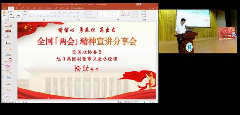 本次分享会由全国政协委员暨旭日集团副董事长兼总经理杨勋先生主讲,杨先生从三个方面系统传达了“两会”精神。一是详细解读了在疫情防控形势下,今年政府工作报告的特殊性;二是中华人民共和国《民法典》,杨勋先生从《民法典》的意义和内容两个方面解释了其重要性;三是关于建立健全香港特别行政区维护国家安全的法律制度和执行机制的决定。最后,杨勋先生在分享会中强调:作为新时代青年,不要惧怕人生路上遇到的困难与挫折,每条成长的路上注定是要充满风雨荆棘,放下包袱,不忘初心,砥砺前行。