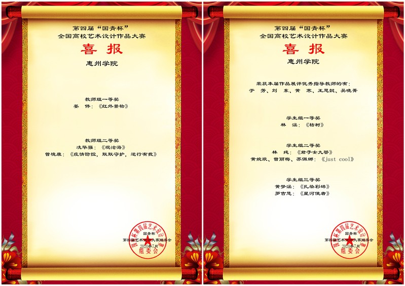 2020年7月21日,由中国人生科学学会主办、中国人生科学学会艺术与设计教育分会承办的第四届“国青杯”全国高校艺术设计作品大赛结果揭晓,我院师生在比赛中荣获多个奖项,其中,我院教师姜伟作品《红外景物》获得教师组一等奖,创新创业指导老师冼华强作品《观沧海》、曾境康作品《疫情防控,默默守护,进行有我》获得教师组二等奖;我院学子林涵作品《枯树》获得学生组一等奖,林纯作品《君子女九簪》、黄婉欣、曾丽梅、苏佩娜作品《just cool》获得学生组二等奖,黄梦涵作品《扎染彩碎》、罗吉慧作品《星河使者》获得学生组三等奖;于芳、刘东、黄寒、王思懿、吴晓菁获得优秀指导教师奖。