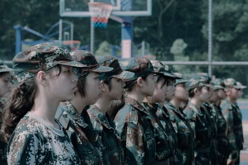 就快接近正午,太阳愈发地毒辣?大滴的汗水顺着脸颊、胳膊往下滑,经过站军姿、练坐姿、正步走等训练,有些同学已有些轻微摇晃,却也没有人真的倒下——都在坚持。不知道天公是都听到同学的呼唤,上午的训练便以一场雨结束了。