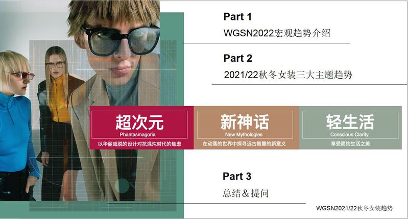 流行趋势是服装各专业方向都需要掌握的基础专业知识。一般来说,主流趋势故事主题是从政治、人文、经济、消费者态度、艺术领域、零售数据、T台分析等综合分析形成具有流行指引方向的蓝本。本季讲座解读了21/22秋冬三大主题趋势:超次元、轻生活、新神话!诠释2021秋冬女装潮流趋势,同时结合女装款式、色彩、廓形、设计细节讲解了女装具体开发方向。每个主题内容还进行了延展分析,并从商业开发角度解读了21秋冬流行色、关键面料、工艺、服装廓形的流行趋势,启发新品开发,验证产品方向。