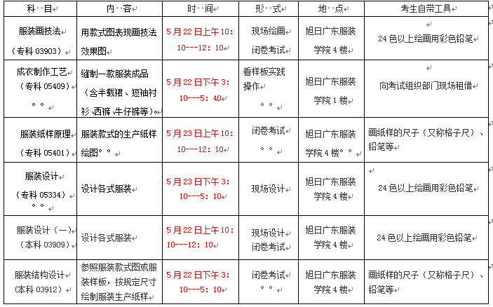 根据省自考办的文件精神,我院定于2021年5月组织一次《服装设计与工程》和《服装与服饰设计》专业的实践考核。具体安排如下: