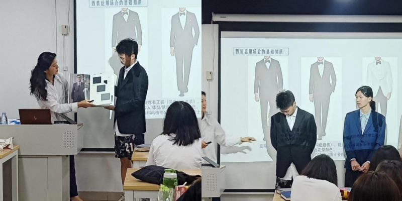 在本次讲座中,战芳女士结合自己在定制行业的多年从业经历,从定制的现在和未来所需的定制、工作服的基础知识和定制流程、环保设计旧衣改造的可持续性发展和应用三个层面切入,给同学们分析了服装定制行业的现状与未来理想的市场所需的定制模式,并对服装定制的基本流程及穿戴基本礼仪做了较为全面的介绍,另外结合行业可持续发展的趋势,分享了其对环保设计旧衣改造的应用的经验及对未来定制服装的设想。最后,战芳女士及其团队还给同学们带来了他们自己亲手通过旧衣扎染再利用的面料制作的艾草香囊小礼物,让同学们能够更直观的感受到环保设计的魅力。
