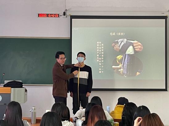 随后,通过同学共同参与,温海兴师兄分享了高级定制的量体、毛样试衣修改等重点环节具体操作与注意事项,温师兄讲练结合,风趣幽默,课堂非常活跃,使同学们对高级定制的技术操作有了更深的认识与体会。
