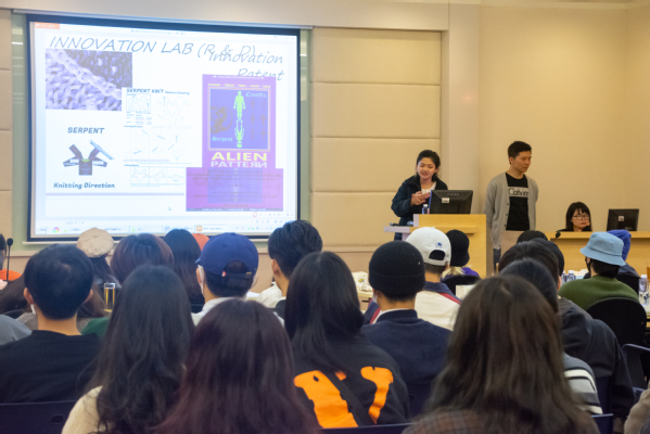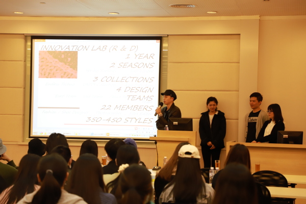 主讲人南旋集团的首席设计师郭钟涵是我院的优秀校友,创意总监关泽殷本科和硕士都毕业于英国诺丁汉特伦特大学,两位具有多年丰富的针织服装设计开发经验。郭钟涵首先介绍了针织企业文化和针织行业的发展趋势,然后详细讲解了针织产品设计中如何融入环保理念,结合科技创新及根据客户需求的设计方法。关泽殷站在企业用人的角度,给学生面试作品集提出了一些宝贵的建议,并鼓励同学们在校学习设计要具创新钻研精神。他还特别提到了自己毕业后选择从英国回祖国工作的原因,时刻牢记自己是中国人,努力为中国的服装行业做贡献。