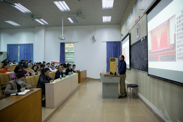 12月8日 下午,我院在服装楼101教室举办了党的十九届六中全会精神专题讲座,旨在全面深入学习宣传贯彻党的十九届六中全会精神,引领学院师生深学笃行,把思想和行动统一到全会精神上来。马克思主义学院院长林清明教授应邀作“深入领会把握党的百年奋斗重大成就和历史经验——学习党的十九届六中全会精神”专题讲座。讲座由党总支书记曾裕林主持,全院教师与部分学生代表参加。
