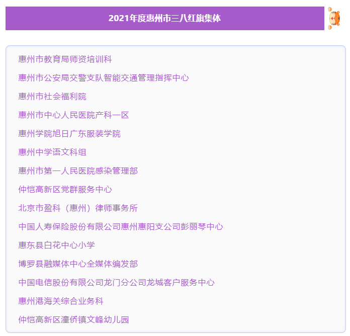 2021年度惠州市三八红旗手(集体)公布。在学校工会的指导下,在全院教职工的共同努力下,旭日广东服装学院荣获2021年度惠州市三八红旗手(集体),助力我院开展“职工小家”创建工作。