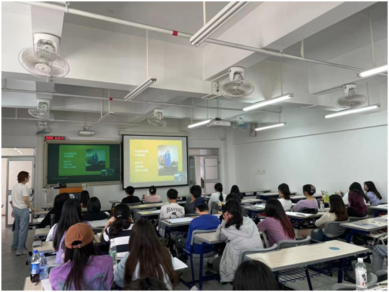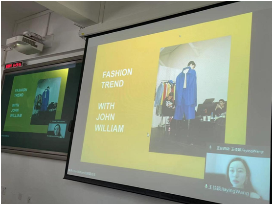 John William老师(英)介绍了时尚秀场如何影响趋势:是服装,购物,社交影响,与文化趋势。用简洁的PPT演示时尚趋势,用简短的小视频介绍了时尚如何影响了街头的穿着。还介绍了英国秀场时装一些经典造型案例,在疫情的影响下,国际直播慕课给设计班的同学带来前沿的设计信息。