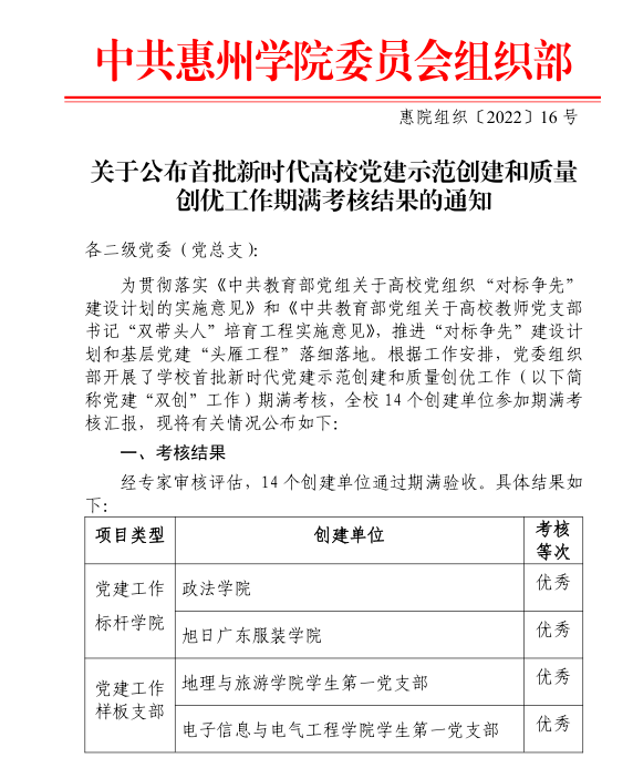 近日,在学校党委组织部开展的学校首批新时代党建示范创建和质量创优工作期满考核中,我院党建工作标杆院系创建获得学校认可,考核等次为“优秀”。