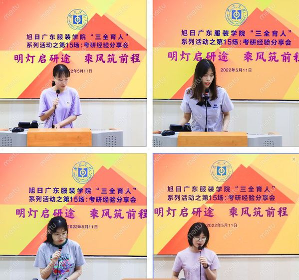 分享会上,成功考取研究生的2018级学生江婷婷、叶青、陈静、邓晴月四位同学分别就如何备考、如何选择考研院校、专业复试等方面进行了经验分享。江婷婷同学表示,数学科目一定要早做准备,多做题目;叶青同学则从考研常识和考研课程两方面做了分享,为我们展示了其考研日历和安排,提供了很好的模板与参考;陈静同学指出,备考进度停滞不前时,要从环境、个人、难度这些方面上理性分析原因,避免过度焦虑,保持良好心态,有条不紊地进行学习;邓晴月同学提到,设计类考研需要尽可能提高手绘质量及应试速度,需要不断练习巩固基础,并以此延伸发展出属于自己的风格,才能更容易抓住考官的眼球。此外,作品集并不能仅局限于自己的毕设或者平时的课堂作业积累,还要从其他地方丰富自己的作品集并完善。在自由问答环节中,四位考研上岸同学对大家提出的问题进行了解答,让现场同学受益匪浅。