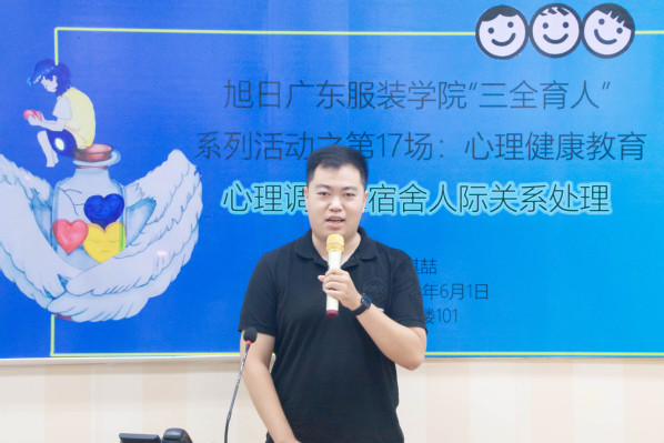 2022年6月1日下午,旭日广东服装学院在服装楼101阶梯课室举办“三全育人”系列活动之第17场心理健康教育讲座。学院党总支副书记陈刚、心理健康教育与咨询中心张淇喆老师、辅导员叶新豪、彭敏珊以及各班心理委员和宿舍舍长参加了此次讲座。