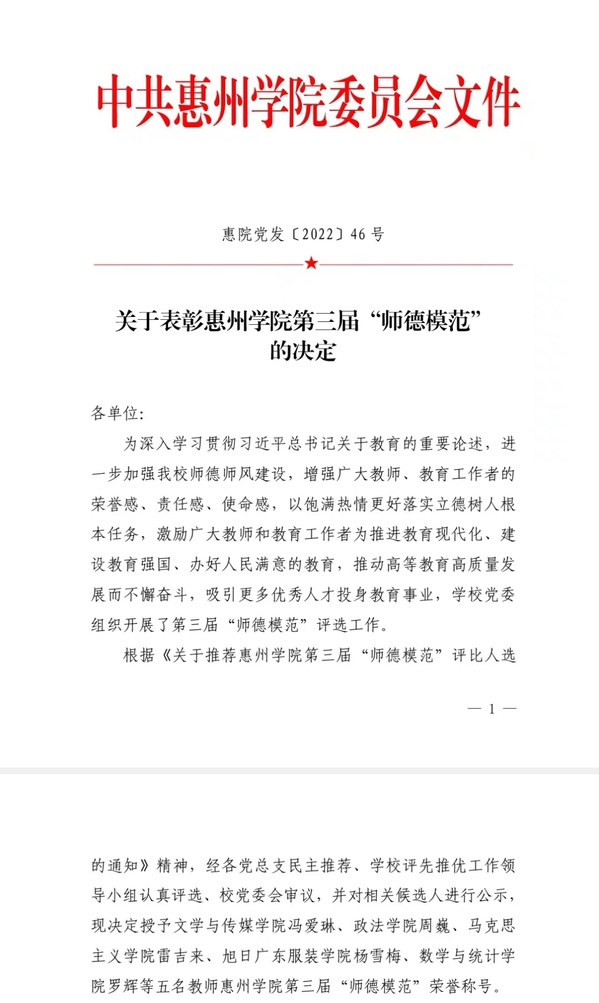 近日,在惠州学院第三届“师德模范”评选活动中,我院教师杨雪梅老师荣获此项殊荣。