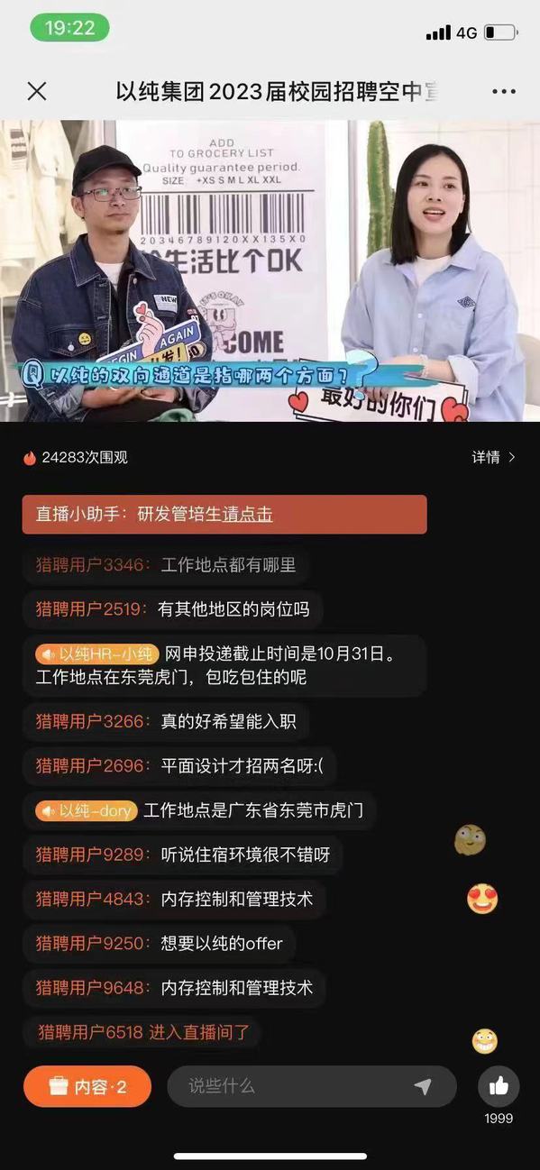 10月17日,东莞市以纯集团有限公司(YISHION)举办了一场线上宣讲会。公司负责人为参会的应届毕业生介绍了公司概况、公司的发展历程以及公司的福利制度。现场气氛活跃,公司负责人与应届生们积极互动。并且公司负责人在线上说明了专场面试安排,宣讲会结束后将会举行第一次筛选,拟招聘人数不限。