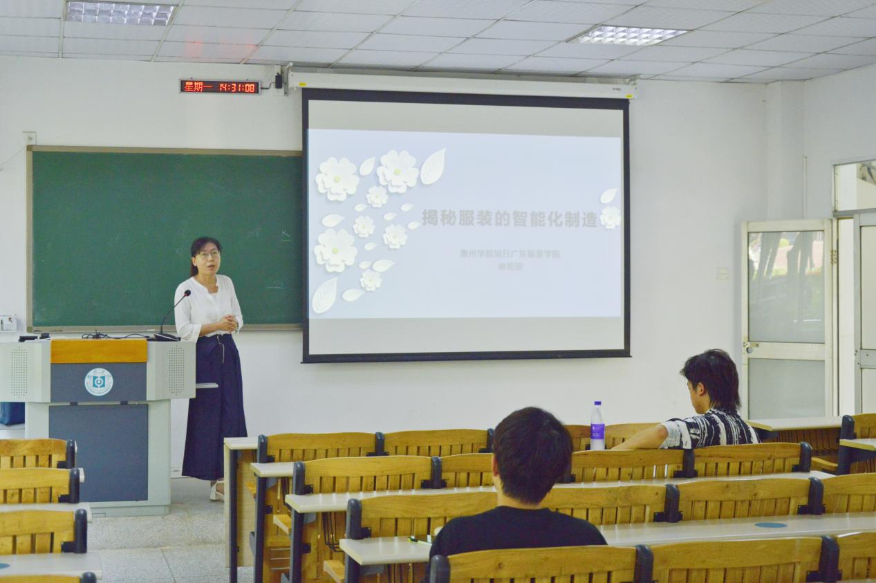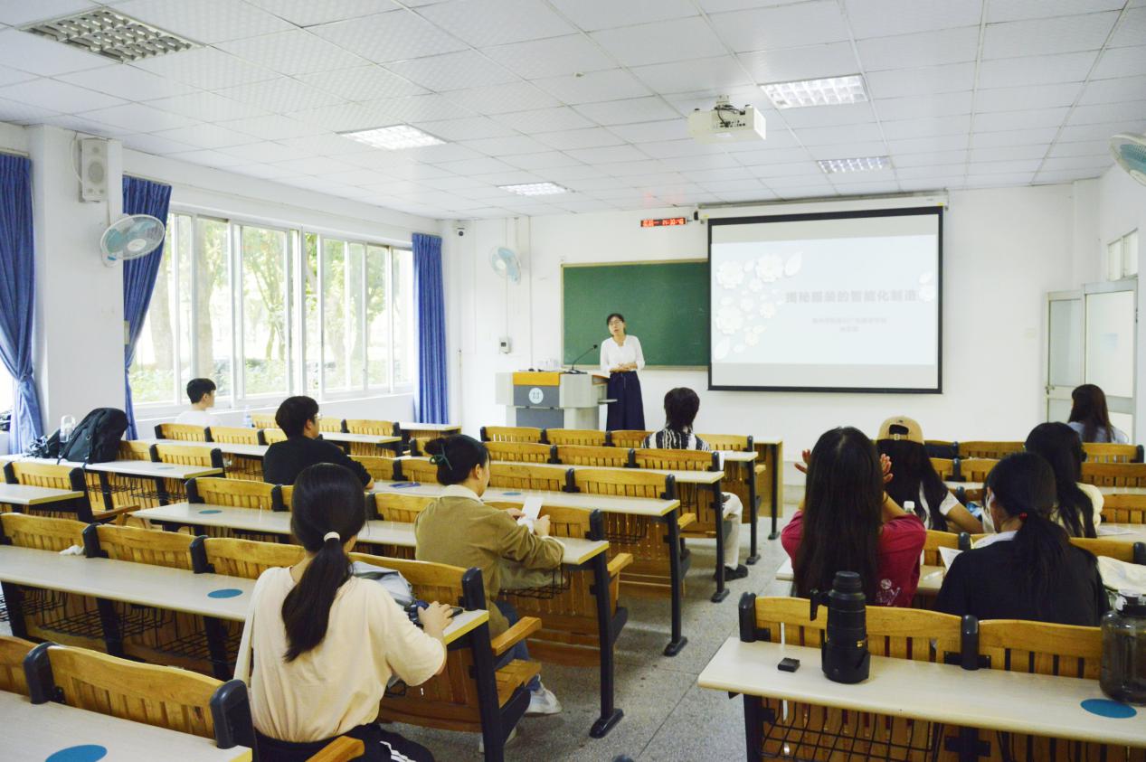 讲座伊始,徐丽丽老师以服装的制成方式为切入话题,通过分析各种面料的特点、各种纤维的性质,剖析服装的制作过程,结合个人经历向同学们展示了智能制造的魅力。徐丽丽老师向同学们介绍了服装智能制造的三个重要方向:天然材料、化学纤维、布料制作。