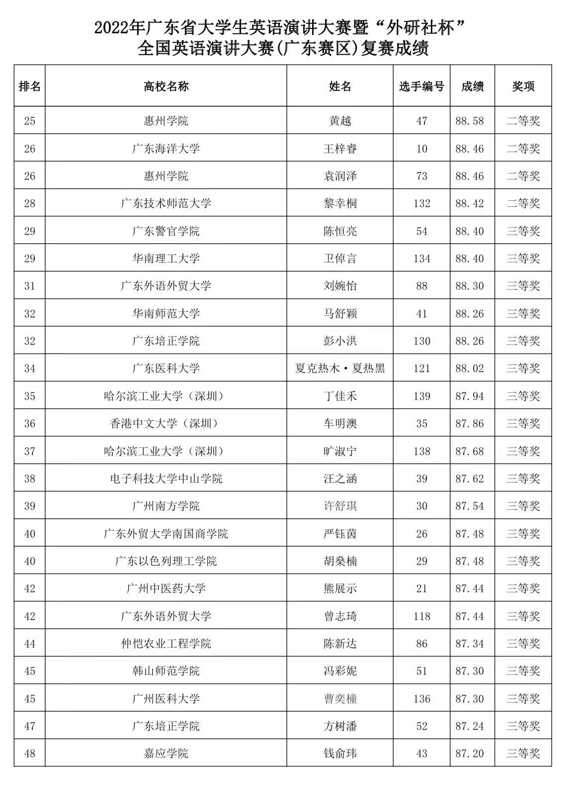 本次比赛需要在校园内经过重重选拔,最终选出两名同学代表惠州学院参加广东省赛区比赛。袁同学作为一名非英语专业的学生,凭借自己的努力与热爱结合学院的合理化教学,在广东省各大高校高手云集的专业英语赛事中,从149名选手中脱颖而出,排名第26,荣获二等奖佳绩。