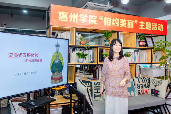 柯宇丹副教授以“沉浸式汉服体验——明代服饰鉴赏”为题为同学们作了一场关于明代汉服款式及文化的介绍,讲解了明代服饰的由来,明代服饰形成的原因,明代衣领的不同、袖口的区别,明代汉服的特点及与其他时代的异同等知识。讲解中,师生们身穿不同的明代汉服加以展示,使同学们更加直观地理解了讲座内容,感受汉服魅力。