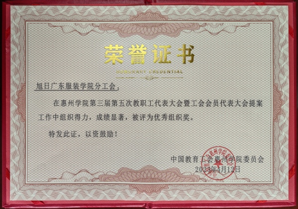 4月12日,学院分工会在惠州学院第三届第五次教职工代表大会暨工会会员代表大会提案工作中,因组织得力,成绩显著,荣获优秀组织奖。