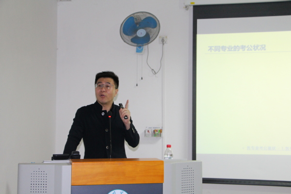 陈刚老师以其资深的公务员培训经验和深厚的授课功底,深入浅出,幽默风趣的向同学们介绍了当前的就业形势,为大家职涯规划、毕业、就业、升学出谋划策,并通过详实的数据、具体的案例、典型的题型,为大家分享了公务员考试的基本要求、基本题型和面试技巧。授课过程互动频频,现场气氛热烈,活泼。