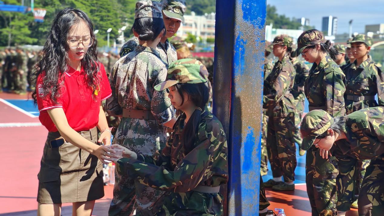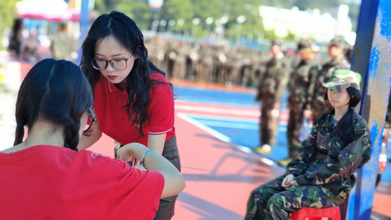 “这里是你们的战场,而我是你们坚强的后盾”。在烈日的猛攻下,部分同学的身体状况不容乐观,党员志愿者贴心地照顾他们,为他们递水扇风,打气加油。