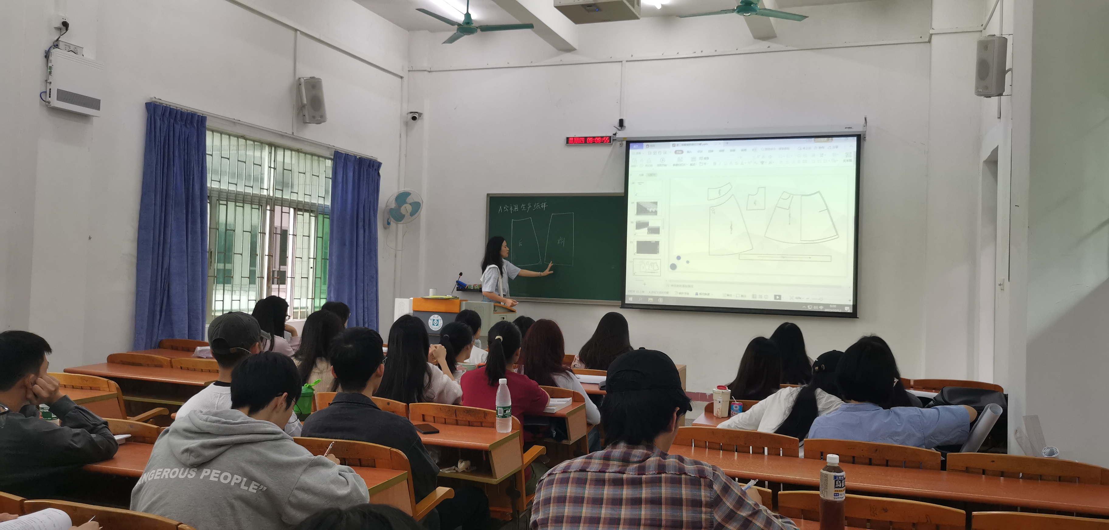 课堂上,刘海金老师结合课程内容和学生掌握情况、课程思政等,重点讲解了服装结构设计中的裙子纸样设计。通过对裙子结构设计内容的回顾引出本节课重点内容裙子的生产纸样;对裙子生产纸样的各个部件进行详细讲解,比如:裙身前后片,腰头、口袋、口袋布的纸样;如何加放缝份量,纸样标注方法等内容详细讲解。最后将制作好的纸样进行3D虚拟,检验纸样是否合适,还从中国传统文化中汲取百纳被元素进行拼接设计,给学生启示;让学生从身边。