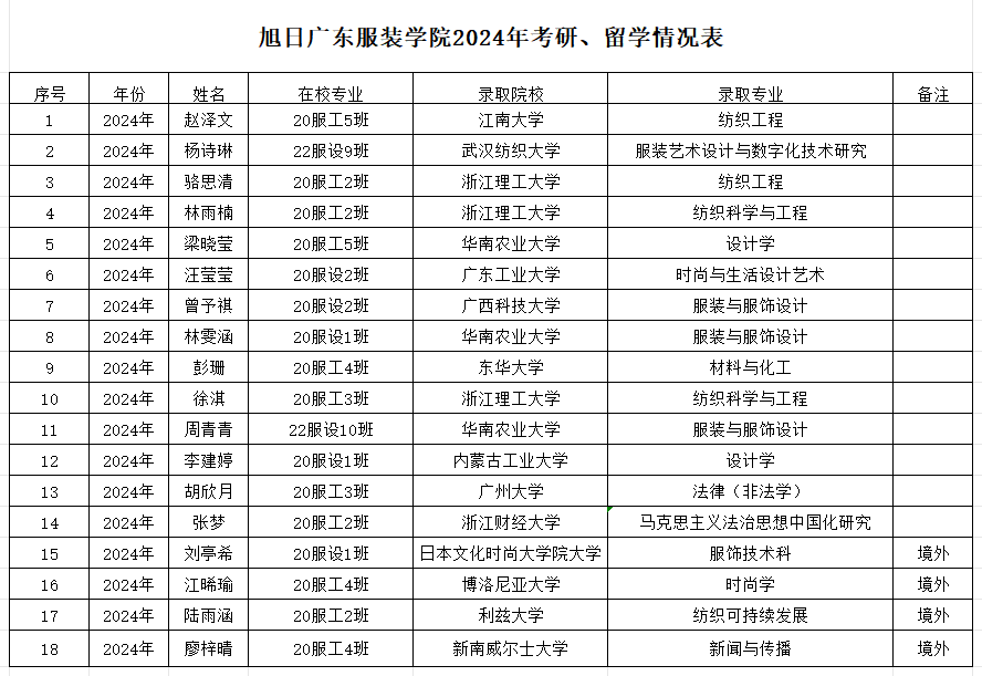 “星光不负赶路人,天道酬勤佳音来。”随着2024年全国硕士研究生考试录取工作的完成,学院考研喜报频传。学院院2024届毕业生中有14名同学分别被东华大学、江南大学、武汉纺织大学、浙江理工大学、华南农业大学等院校录取,2024届毕业生中还有4名同学获取境外求学的机会,分别被日本文化学园、利兹大学、意大利博洛尼亚大学、新南威尔士大学录取。