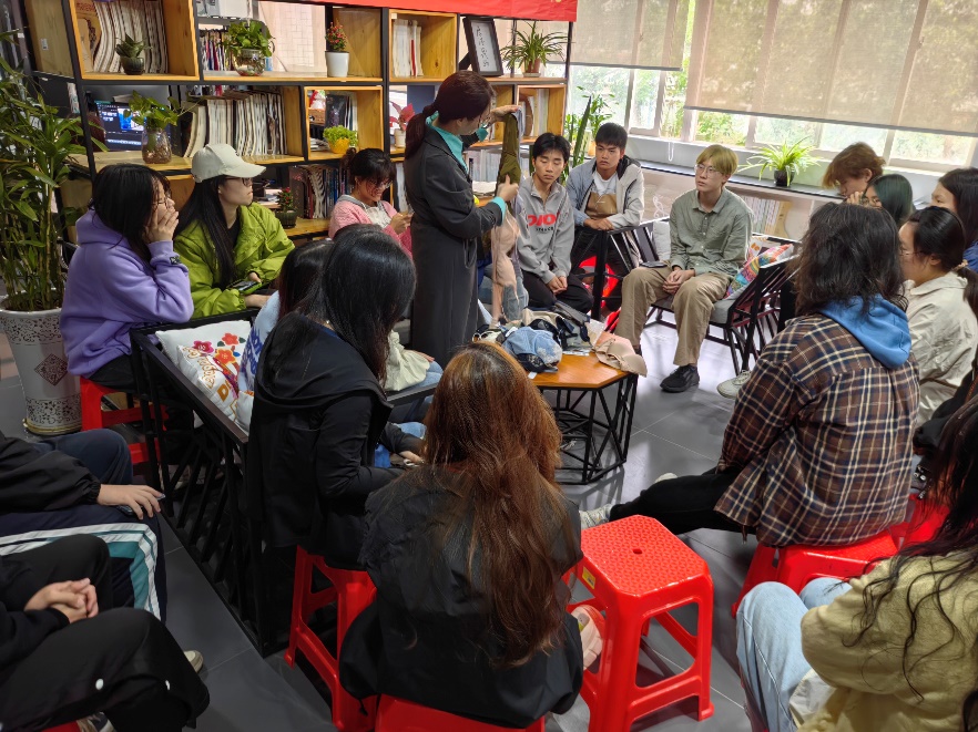 在课程中,黄小齐女士带来了公司众多的品牌内衣样版,结合产品实物,分析了近些年文胸流行的样式、面料、色彩图案等。还请同学们试穿了各种杯型的文胸,让同学们对尺码和杯型的设计有深刻的认知,通过亲自观察与试穿样品,同学们感受到内衣的时尚魅力。