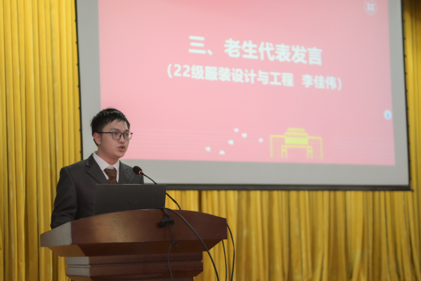 2022级服工3班李佳伟同学以学长的视角阐述了服装学院之风貌,字里行间洋溢着新时代青年的责任与担当精神,他勉励新生们在课堂上要勤奋好学,勇于提问;在社团活动中要积极参与,锻炼自己的组织协调能力和团队合作精神;在学生会工作中要敢于担当,提升自己的管理能力和处世智慧。