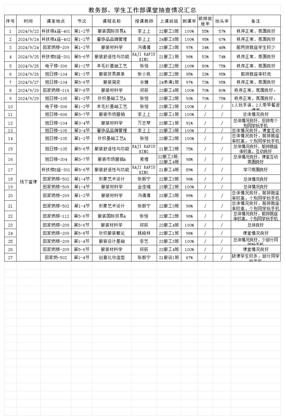 为了解学生课堂学习状态以及课堂教学情况,服装学院督导组于9月份进行了不定期教学督导巡查听课活动。学院副院长索理率领学院教学督导成员分组深入课堂,对教学秩序、教学内容、教学方法、教学效果等方面进行了全面的督导和检查。