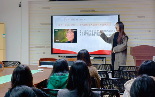 她围绕认识社会主义核心价值观、感悟社会主义核心价值观、践行社会主义核心价值观三大维度,引导入团积极分子展开对人生观的深入探讨。从理论剖析到情感共鸣,再到实践指引,层层递进,为入团积极分子的思想发展指明方向,助力其在追求入团的道路上筑牢思想根基。