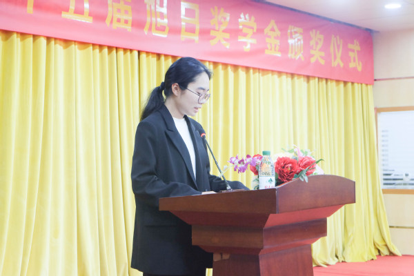 会上,获奖学生代表董楠楠同学发表获奖感言,她代表所有获奖同学感谢旭日集团长期以来对惠州学院学子的关爱与鼓励,表示将持续保持学习动力,以更加坚定的信念和不懈的努力,谱写新时代优秀青年的篇章。