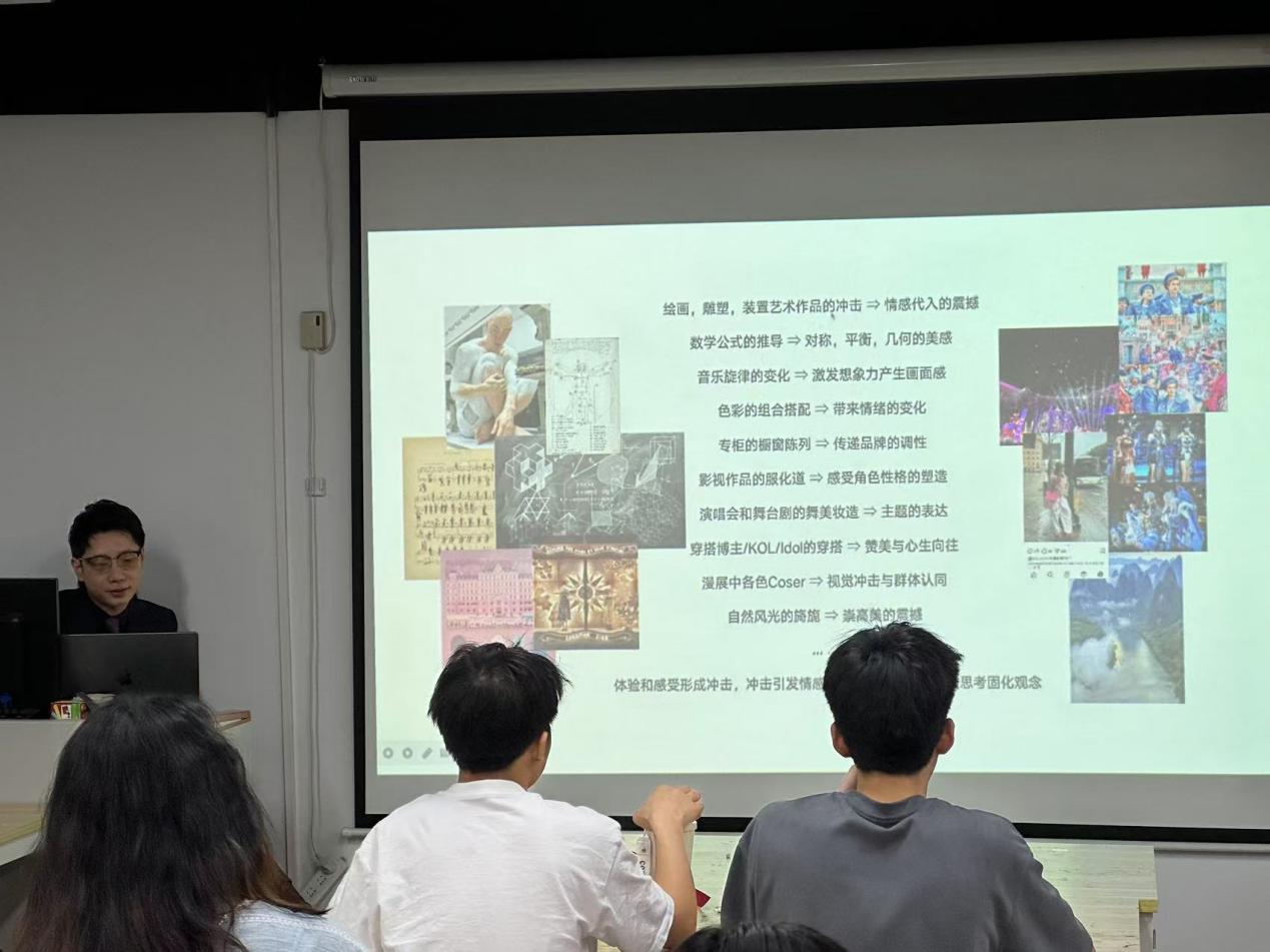 同时,林景浩先生还借助绘画、雕塑、装置艺术作品等案例,引导学生感受艺术作品带来的情感冲击,体会色彩组合、音乐旋律变化等元素与时尚设计的关联。他指出,色彩的搭配能带来情绪变化,音乐旋律的激发想象力产生画面感,这些都能为服装与服饰配饰设计提供灵感源泉。