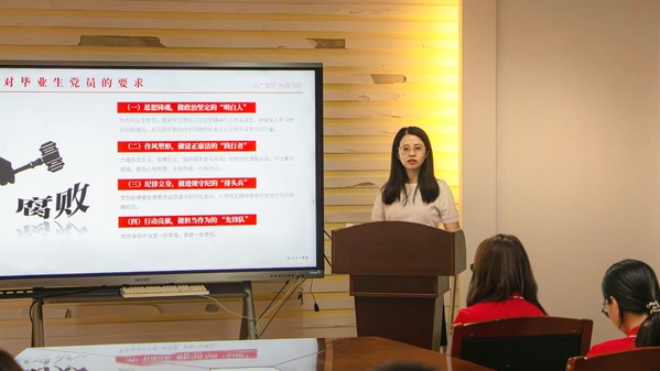 党委副书记李少璃以《以党纪为尺,丈量青春担当》为题讲授党课。她从全面从严治党的高度出发,结合实际案例,深入解读中央八项规定精神内涵,强调“密切联系群众、工作精简高效、永葆廉洁自律”的实践要求。她勉励毕业生党员:一要做政治坚定的“明白人”,始终对党忠诚、信念如磐;二要做清正廉洁的“践行者”,将纪律意识融入日常;三要做遵规守纪的“排头兵”,以身作则树立标杆;四要做担当作为的“先锋队”,在新岗位上勇挑重担、积极作为。