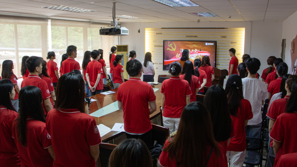 在李佳伟同志的带领下,全体党员面向党旗重温入党誓词。铿锵有力的誓言回荡会场,既是对党的庄严承诺,也是对自我的深刻鞭策。随后,全体党员齐唱《国际歌》,激昂的歌声中饱含着党员们不忘初心、牢记使命的坚定信念。