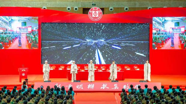 典礼现场,除了这场满含初心的服装秀,“爱国三问”的铿锵作答、校党委书记彭永宏为新生佩戴校徽并赠送《习近平与大学生朋友们》、校长王胜以“铭记抗战精神 勇担青春使命”为题讲授“思政第一课”等环节,亦层层递进传递历史厚重感;全体新生宣誓“创新争先不负时,复兴伟业不负民”,更将责任与信念镌刻于心。