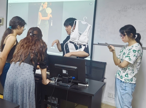在实操指导中,黄琳生先生结合他近10年行业经验,针对学生设计初稿中存在的问题逐一拆解:对 “色彩搭配与市场定位脱节” 的方案,结合消费群体调研数据提出优化方向。对 “面料选择与版型贴合度不足” 的作品,现场展示贴合效果;通过与小组讨论、面对面辅导等形式,同步传授设计方案、优化效果等实用技能。