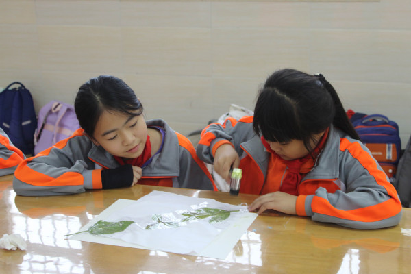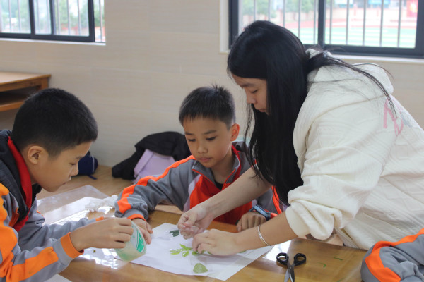 植物拓印课堂同样热闹,桌面上整齐摆放着提前收集的各色树叶与花瓣。老师先演示挑选叶片、构图摆放、固定植物、均匀敲打的完整流程,着重强调敲打力度与角度的技巧,随后让二年级的小同学动手实践。