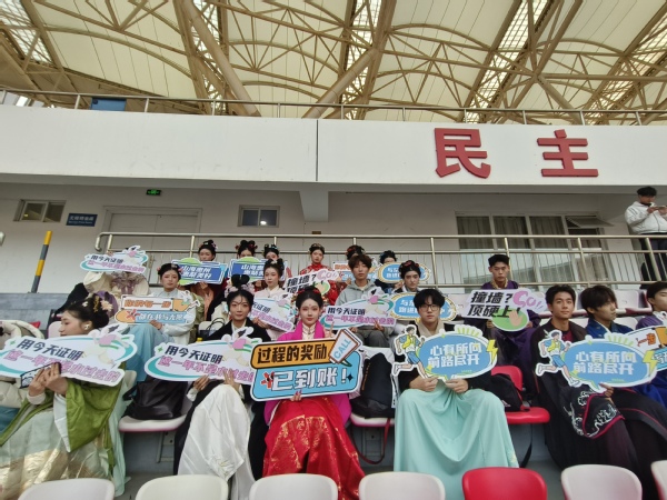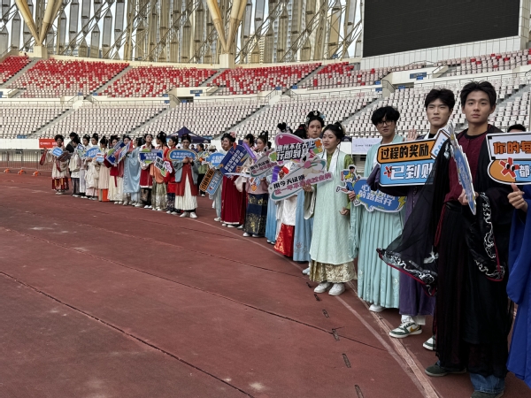 表演专业学子精心筹备,身着涵盖不同朝代、不同风格的系列汉服亮相终点区域。活动现场,学子们以饱满的精神状态、专业的表演姿态,为每一位冲线的参赛选手呐喊助威、送上祝福。整齐划一的加油手势、昂扬向上的精神风貌,将赛场胜利的喜悦与欢乐氛围推向高潮。她们的精彩表现不仅赢得了参赛选手、现场观众的一致赞誉,更成为各大媒体镜头下的焦点,生动展现了惠州学院学子的青春风采与专业素养。