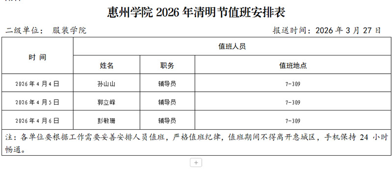 惠州学院服装学院2026年清明节值班安排表