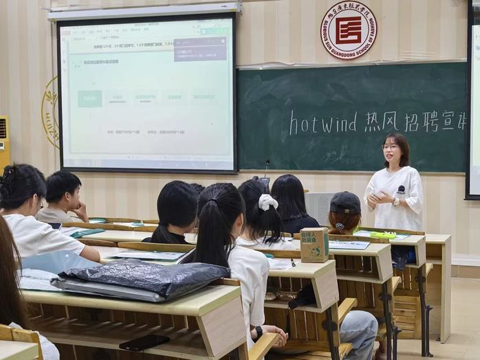 9月28日下午,热风集团在服装楼101举办了一场宣讲会,部分应届生参加了此次校园招聘会。公司负责人为参会的应届毕业生介绍了公司概况、公司发展历程、以及福利状况。现场氛围活跃,公司负责人与应届生们有着积极互动。宣讲会上公司负责人介绍了对应届毕业生的面试模式以及参与工作后的工作内容、工作环境、晋升条件以及公司福利等。同时,公司负责人在线上说明了专场面试安排,宣讲会结束后将会举行第一次筛选。